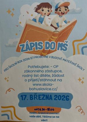 Milí rodiče, zveme všechny předškoláky z MŠ Bohuslavice i z okolních vesnic na naši Školičku, kde si děti mohou vyzkoušet, jaké to je být opravdovým školákem!